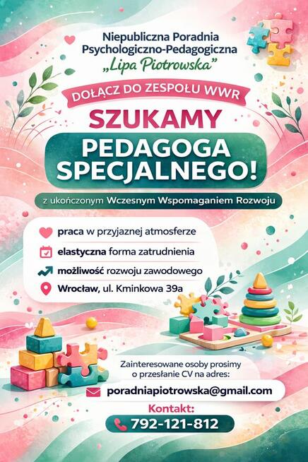 Niepubliczna Poradnia Psychologiczno-Pedagogiczna poszukuje PEDAGOGA SPECJALNEGO z ukończonymi studiami w zakresie Wczesnego ...